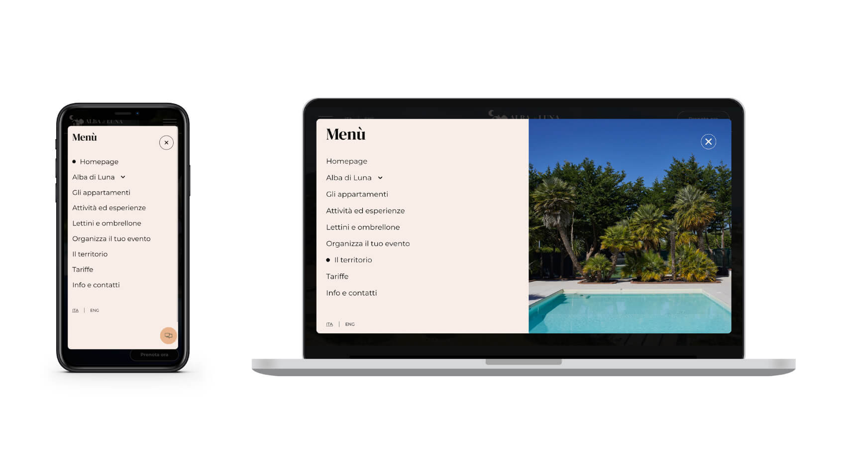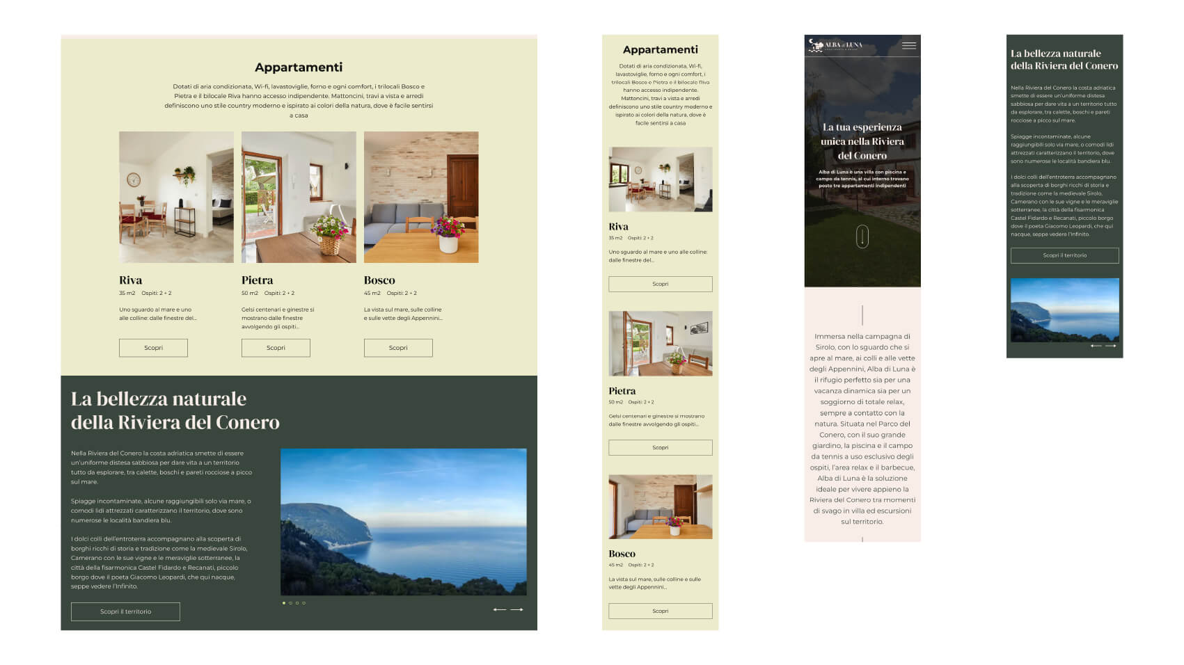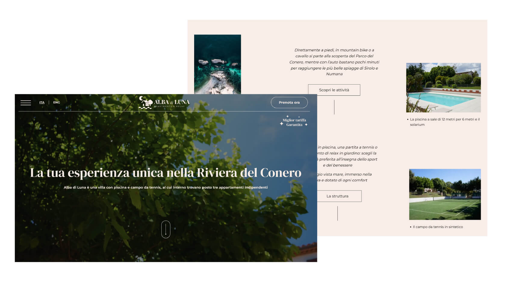 Alba di Luna è un casolare situato a Sirolo, nel cuore della Riviera del Conero. Si trova su una piccola altura da cui si scorge il mare, circondato dal verde e dotato di tre appartamenti in affitto, una piscina e un campo da tennis. Per valorizzare questo luogo unico, ho progettato una visual identity che ne cattura l'essenza e l'atmosfera. Successivamente, ho disegnato e sviluppato un sito web moderno e accattivante che riflette lo statement di Alba di Luna. Il sito multilingue è stato realizzato per offrire agli utenti un'esperienza coinvolgente, mostrando le caratteristiche del casolare e le attività disponibili, invitando gli ospiti a vivere appieno tutto ciò che Alba di Luna ha da offrire.
