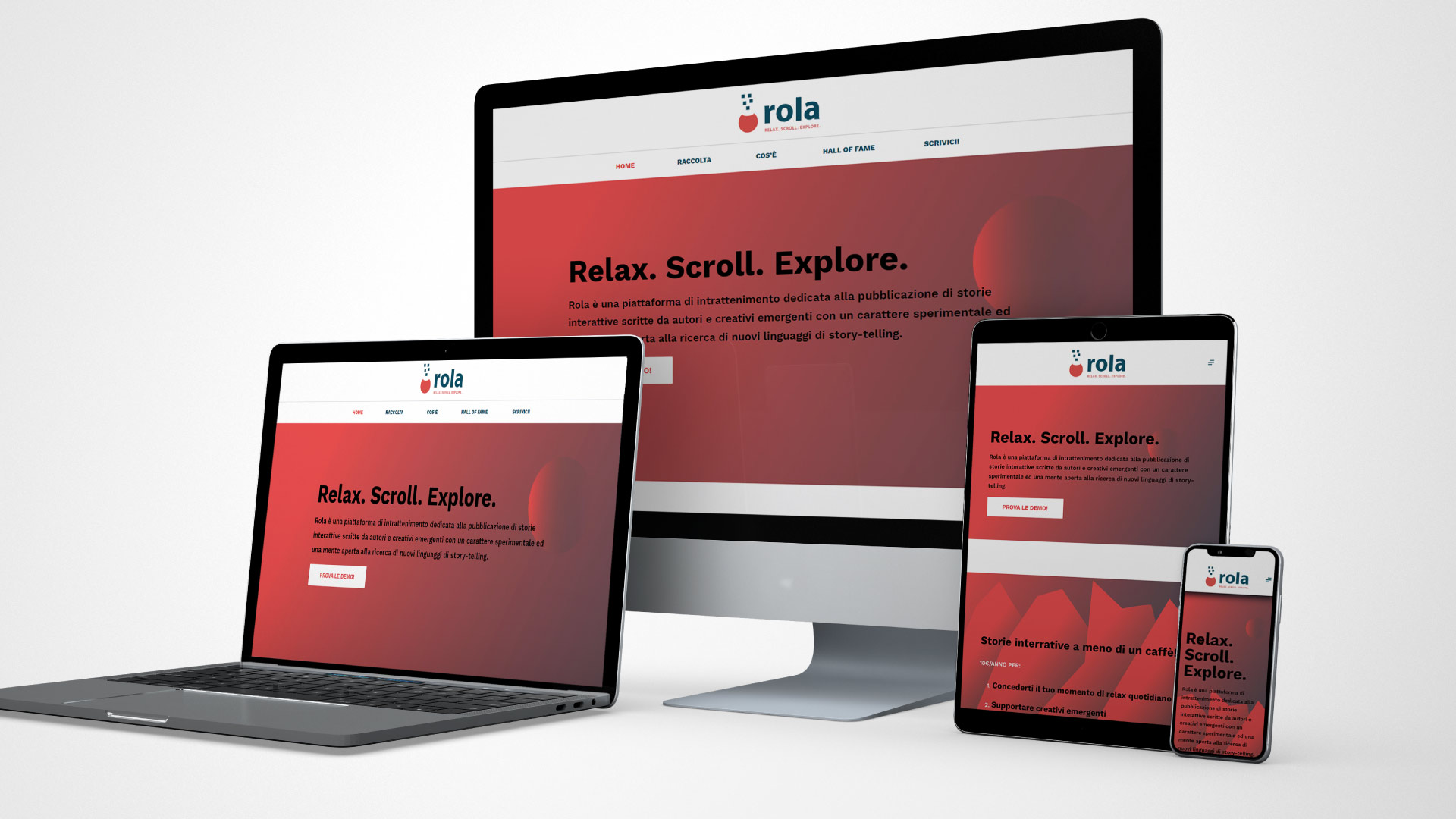 Quando si parla di Web, l'azione più comune effettuata dagli utenti per la fruizione di contenuti è lo scorrimento (SCROLL). Rola si propone come una piattaforma da utilizzare per godersi i momenti di pausa (RELAX) e lasciarsi trasportare dalle storie proposte (EXPLORE).