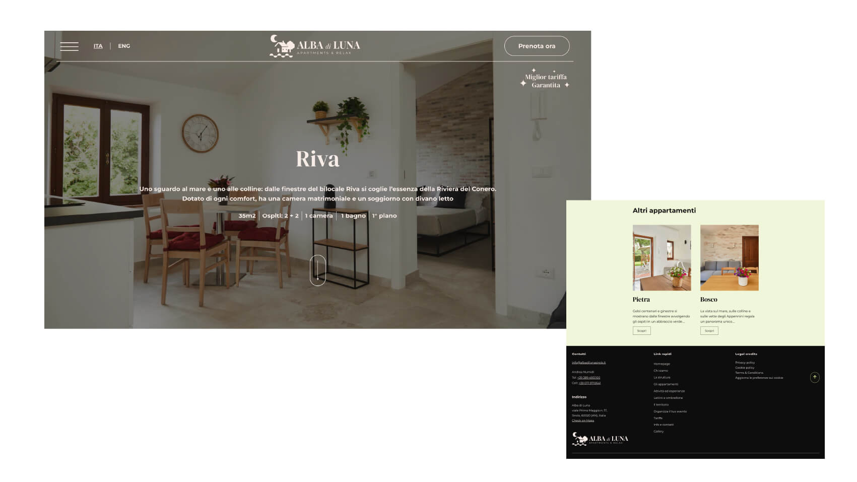 Alba di Luna è un casolare situato a Sirolo, nel cuore della Riviera del Conero. Si trova su una piccola altura da cui si scorge il mare, circondato dal verde e dotato di tre appartamenti in affitto, una piscina e un campo da tennis. Per valorizzare questo luogo unico, ho progettato una visual identity che ne cattura l'essenza e l'atmosfera. Successivamente, ho disegnato e sviluppato un sito web moderno e accattivante che riflette lo statement di Alba di Luna. Il sito multilingue è stato realizzato per offrire agli utenti un'esperienza coinvolgente, mostrando le caratteristiche del casolare e le attività disponibili, invitando gli ospiti a vivere appieno tutto ciò che Alba di Luna ha da offrire.