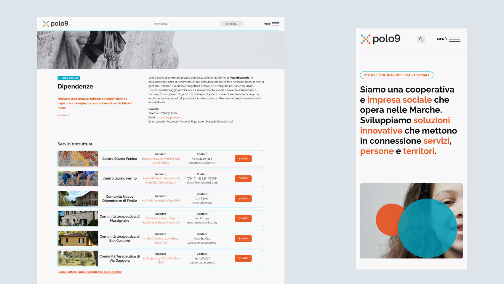 Polo9, una società cooperativa attiva nel settore sociale, aveva difficoltà a comunicare efficacemente online a causa di un sito poco performante, con una UX inadeguata e una UI obsoleta. Ho contribuito a migliorare questo aspetto sviluppando una UX ottimizzata, seguita da una UI moderna e accattivante.
