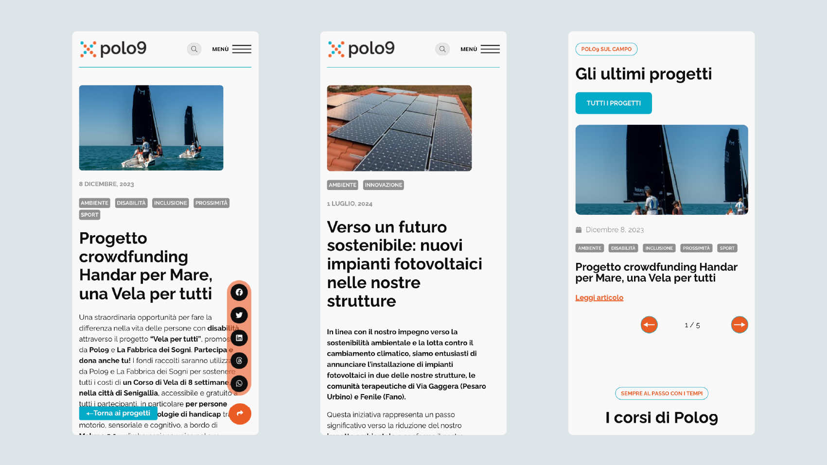 Grazie a questo progetto, il sito ha finalmente un'architettura delle informazioni che organizza e gerarchizza chiaramente tutte le diverse tipologie di contenuti. Il progetto ha incluso anche lo sviluppo stesso del sito, creando una soluzione personalizzata e su misura per le esigenze specifiche di Polo9.